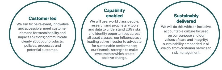 While our responsibilities and obligations in each of these three roles may differ, as we discuss below, our approach in all three is united by a common set of principles and ambitions, set out in the box at the bottom of the page.We also have the important responsibility of deciding the financial outcomes we want our asset managers to deliver for us, and the sustainability considerations we require them to apply.